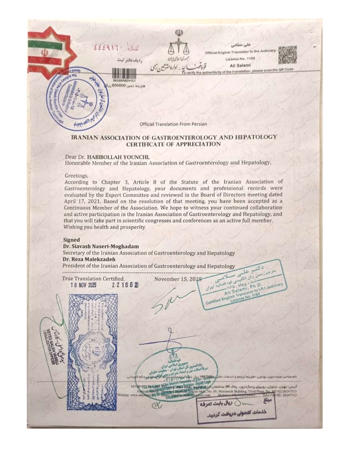 Over nearly three decades of medical practice, Dr. Habibollah Younchi has developed extensive experience in internal medicine and advanced interventional endoscopy. His career trajectory demonstrates continuous innovation in diagnostic techniques, early cancer detection, and minimally invasive therapeutic procedures across leading hospitals in Iran.
